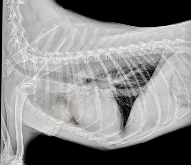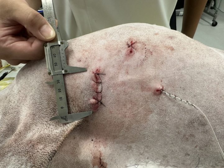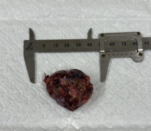 胸腺腫の治療は外科手術が第一選択とされています。しかし、手術方法としては胸骨正中切開という大きく胸を開く方法をとることが一般的です。この方法は手術による体への負担が大きく、痛みも強いです。そのため、今回は胸腔鏡を使用した切除手術を行いました。3か所のポート孔(それぞれ約1cm)から手術器具とカメラを挿入し、腫瘍を切除しました。3か所のうち2か所のポート孔を繋げて腫瘍を取り出し、ドレーンを設置後に閉創しました。今回の手術では切開創が約4cmと1cmの2か所のみであり、最小限の負担で手術を行うことができました。翌日にはドレーンを抜去し、食欲もあるため退院、一週間後には抜糸をしました。病理検査から腫瘍は胸腺腫(タイプB3)と診断されました。